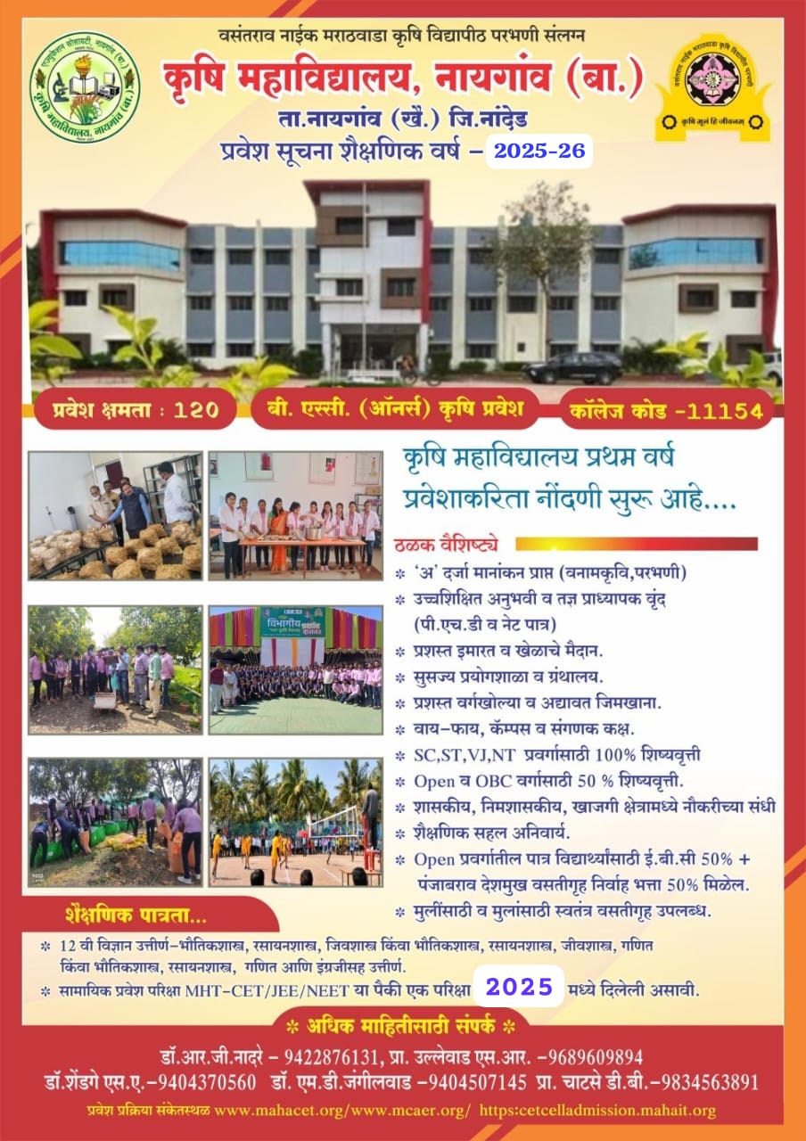 Education Society Naigaon (Bz.) is a philosophy of service which respects and values the dignity and worth of each person of varying background of rich, poor, urban and rural. The education we offer is qualitative and our highly qualified, experienced team is committed to make it worth to every individual. The institute is a very potential N.G.O. serving members of rural public for more than 50 years. The mission of Education society Naigaon (B z.) is to create opportunities for rural students to access and succeed in higher education so that they may improve their professional skills with the goal of enhancing their day-to-day life and their intellectual acumen, while increasing their standard of living. The Education Society Naigaon (Bz.) (Hereafter mentioned as ESN) is one of the renowned institution in the region due to its excessive contribution in the field of education and social welfare. The ESN has opened doors of high quality education for the students of rural area by making available wide range of facilities from Primary education to Post graduation through diploma and degree courses in Arts, Commerce and Science streams covering disciplines like Teachers training, Agriculture, Food technology, Engineering, Information Technology, Pharmacy. All these courses are recognized by respective universities/ Board of Technical Education etc
